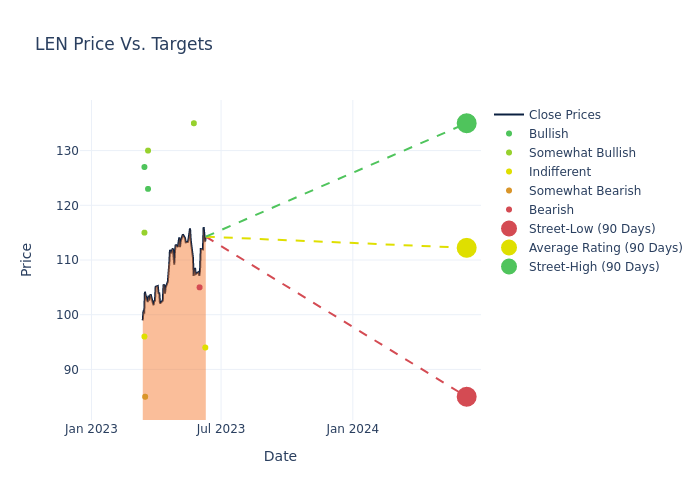 According to 10 analyst offering 12-month price targets in the last 3 months, Lennar has an average price target of $113.0 with a high of $135.00 and a low of $85.00.