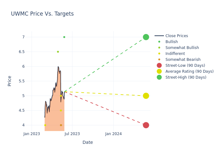 According to 10 analyst offering 12-month price targets in the last 3 months, UWM Hldgs has an average price target of $4.78 with a high of $7.00 and a low of $3.50.