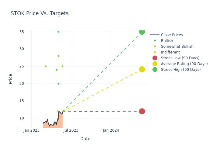 In the last 3 months, 12 analysts have offered 12-month price targets for Stoke Therapeutics. The company has an average price target of $25.17 with a high of $35.00 and a low of $12.00.