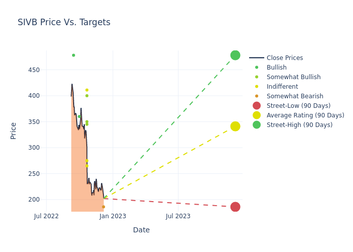 According to 13 analyst offering 12-month price targets in the last 3 months, SVB Finl Gr has an average price target of $355.31 with a high of $495.00 and a low of $186.00.