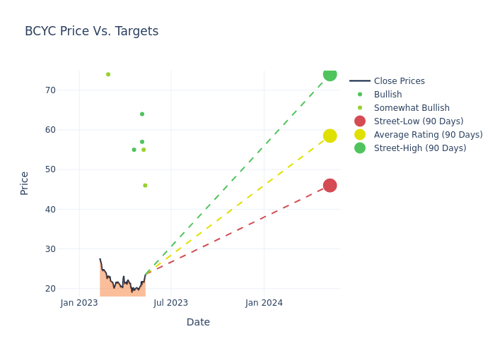 In the last 3 months, 14 analysts have offered 12-month price targets for Bicycle Therapeutics. The company has an average price target of $57.57 with a high of $74.00 and a low of $46.00.