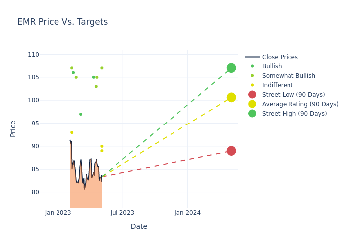 In the last 3 months, 16 analysts have offered 12-month price targets for Emerson Electric. The company has an average price target of $99.75 with a high of $107.00 and a low of $89.00.