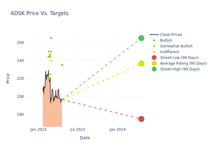 According to 19 analyst offering 12-month price targets in the last 3 months, Autodesk has an average price target of $238.26 with a high of $265.00 and a low of $175.00.