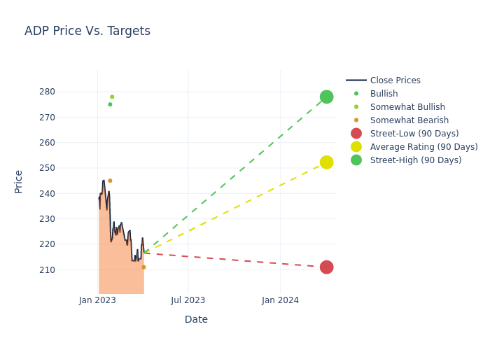 According to 4 analyst offering 12-month price targets in the last 3 months, Automatic Data Processing has an average price target of $252.25 with a high of $278.00 and a low of $211.00.