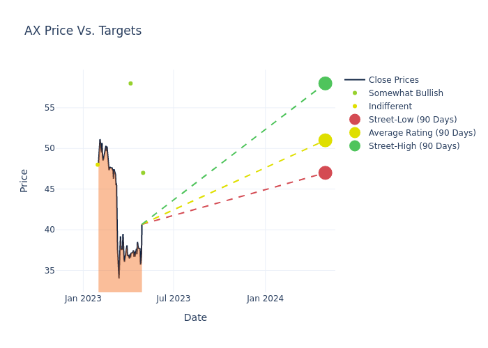 According to 4 analyst offering 12-month price targets in the last 3 months, Axos Financial has an average price target of $51.0 with a high of $58.00 and a low of $44.00.