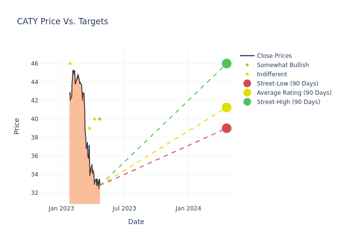 According to 4 analyst offering 12-month price targets in the last 3 months, Cathay General has an average price target of $41.25 with a high of $46.00 and a low of $39.00.