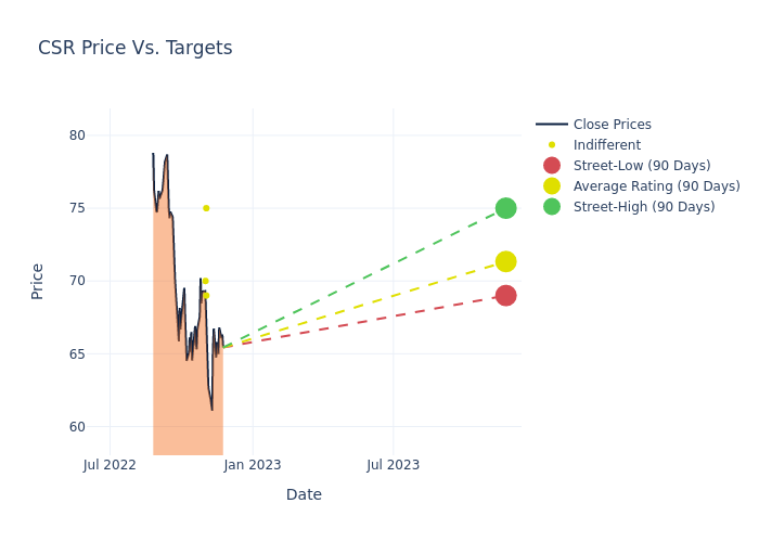 In the last 3 months, 4 analysts have offered 12-month price targets for Centerspace. The company has an average price target of $74.75 with a high of $85.00 and a low of $69.00.
