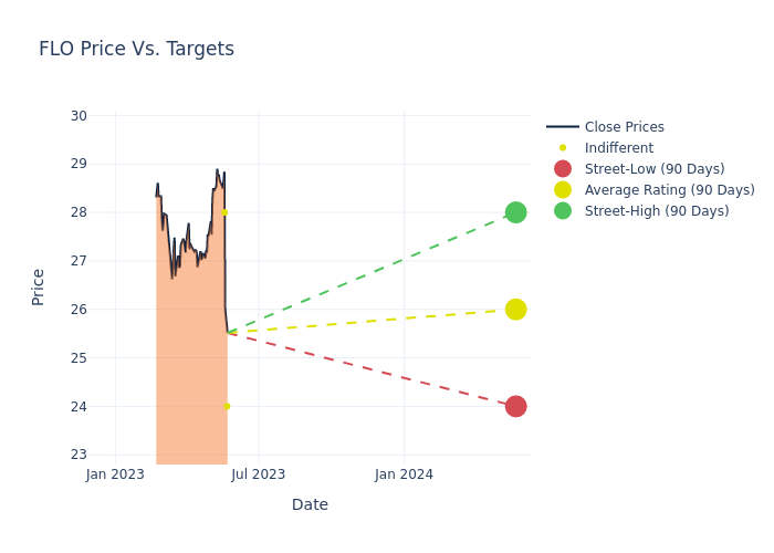 According to 4 analyst offering 12-month price targets in the last 3 months, Flowers Foods has an average price target of $26.25 with a high of $28.00 and a low of $24.00.