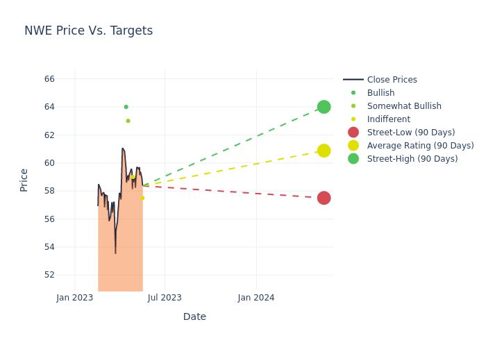 According to 4 analyst offering 12-month price targets in the last 3 months, NorthWestern has an average price target of $60.88 with a high of $64.00 and a low of $57.50.