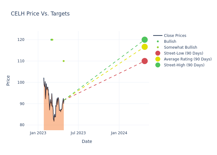 According to 5 analyst offering 12-month price targets in the last 3 months, Celsius Holdings has an average price target of $118.0 with a high of $120.00 and a low of $110.00.