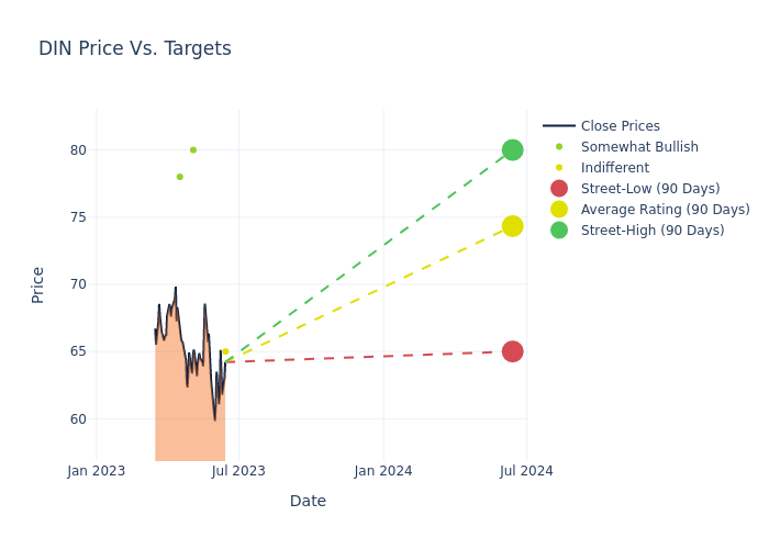According to 5 analyst offering 12-month price targets in the last 3 months, Dine Brands Global has an average price target of $77.6 with a high of $85.00 and a low of $65.00.