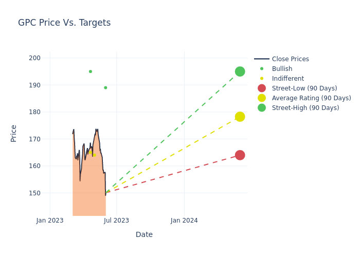 In the last 3 months, 5 analysts have offered 12-month price targets for Genuine Parts. The company has an average price target of $179.8 with a high of $195.00 and a low of $164.00.