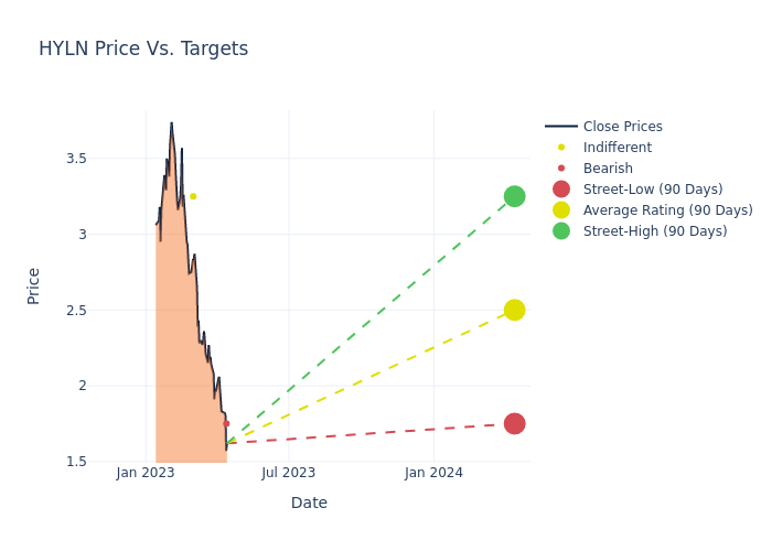 In the last 3 months, 5 analysts have offered 12-month price targets for Hyliion Holdings. The company has an average price target of $2.35 with a high of $3.25 and a low of $1.75.