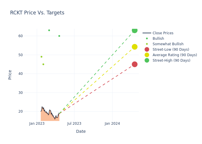 According to 5 analyst offering 12-month price targets in the last 3 months, Rocket Pharmaceuticals has an average price target of $55.4 with a high of $63.00 and a low of $45.00.