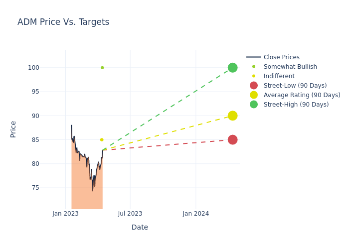 According to 6 analyst offering 12-month price targets in the last 3 months, Archer-Daniels Midland has an average price target of $90.83 with a high of $100.00 and a low of $85.00.