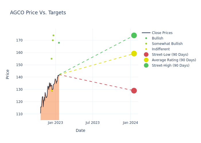 According to 7 analyst offering 12-month price targets in the last 3 months, AGCO has an average price target of $151.14 with a high of $174.00 and a low of $119.00.