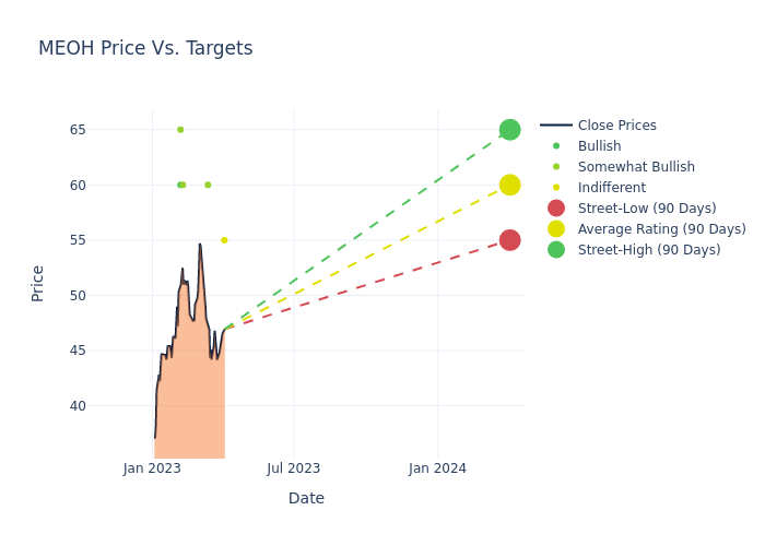 In the last 3 months, 7 analysts have offered 12-month price targets for Methanex. The company has an average price target of $58.14 with a high of $65.00 and a low of $50.00.
