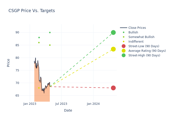 According to 8 analyst offering 12-month price targets in the last 3 months, CoStar Gr has an average price target of $83.75 with a high of $90.00 and a low of $68.00.