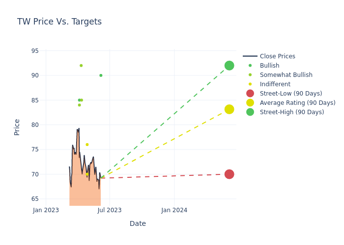 According to 9 analyst offering 12-month price targets in the last 3 months, Tradeweb Markets has an average price target of $84.33 with a high of $92.00 and a low of $70.00.