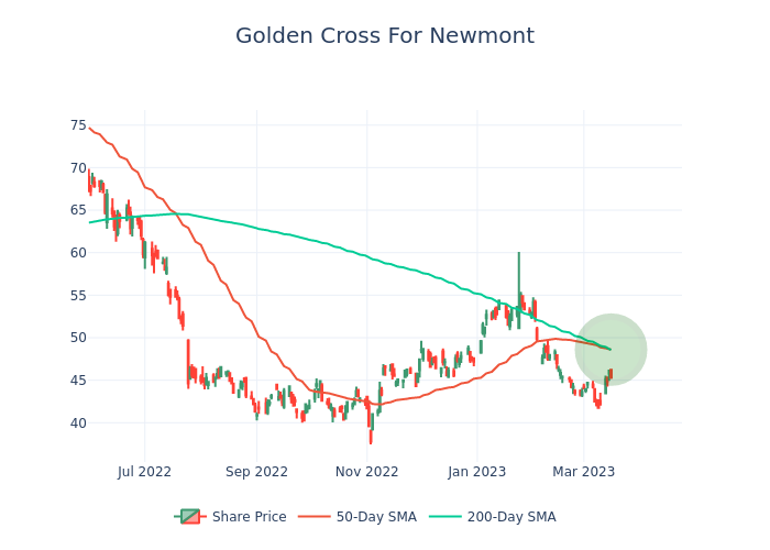 If history is any guide, there may be good fortune ahead for shares of Newmont (NYSE:NEM). A so-called “golden cross” has formed on its chart and, not surprisingly, this could be bullish for the stock.
