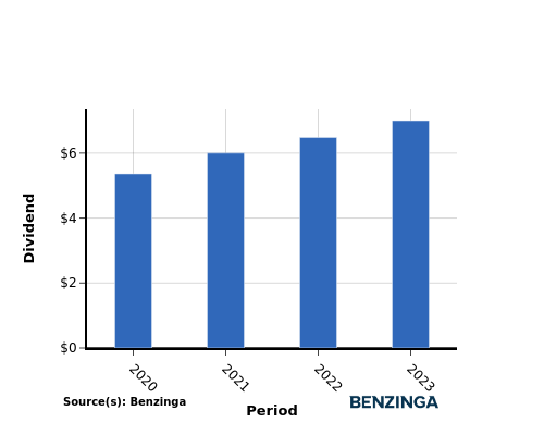 From 2020 to 2023, the company’s dividend per share showed a positive trend, increasing steadily from $5.36 in 2020 to $7.00 in 2023. This demonstrates the company’s commitment to rewarding shareholders by consistently raising dividends.