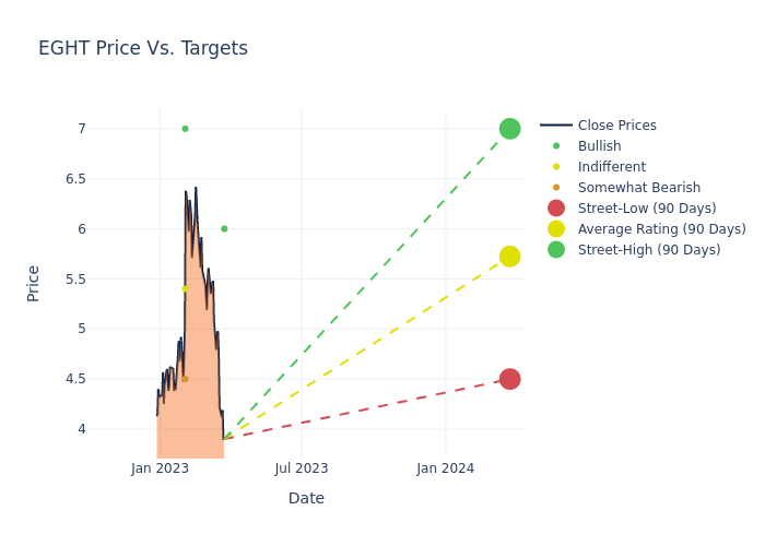 According to 4 analyst offering 12-month price targets in the last 3 months, 8×8 has an average price target of $5.72 with a high of $7.00 and a low of $4.50.