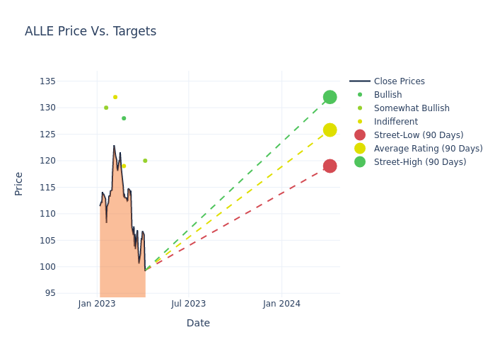 According to 6 analyst offering 12-month price targets in the last 3 months, Allegion has an average price target of $125.33 with a high of $132.00 and a low of $119.00.