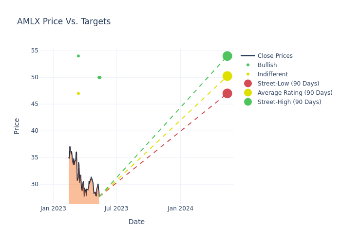 In the last 3 months, 7 analysts have offered 12-month price targets for Amylyx Pharma. The company has an average price target of $50.43 with a high of $54.00 and a low of $47.00.