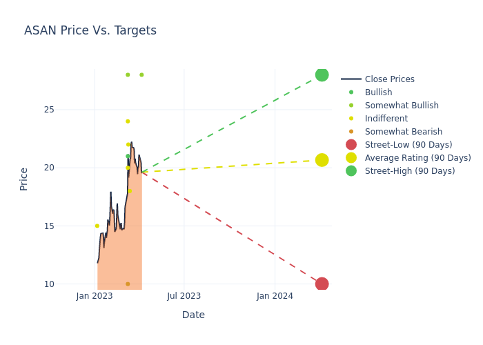In the last 3 months, 11 analysts have offered 12-month price targets for Asana. The company has an average price target of $21.18 with a high of $28.00 and a low of $10.00.