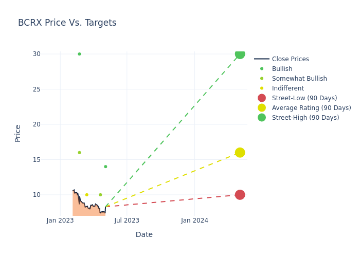 According to 7 analyst offering 12-month price targets in the last 3 months, BioCryst Pharma has an average price target of $15.43 with a high of $30.00 and a low of $10.00.