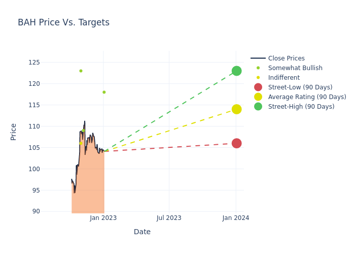 According to 5 analyst offering 12-month price targets in the last 3 months, Booz Allen Hamilton has an average price target of $113.2 with a high of $123.00 and a low of $106.00.