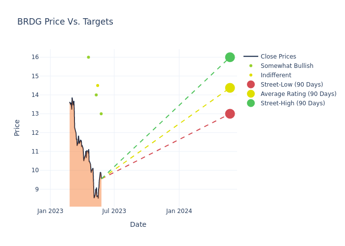 According to 4 analyst offering 12-month price targets in the last 3 months, Bridge Investment Group has an average price target of $14.38 with a high of $16.00 and a low of $13.00.
