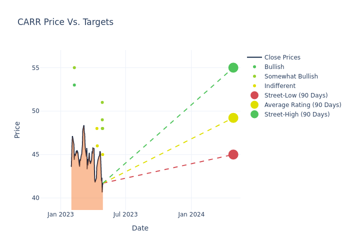 In the last 3 months, 14 analysts have offered 12-month price targets for Carrier Global. The company has an average price target of $49.5 with a high of $55.00 and a low of $45.00.