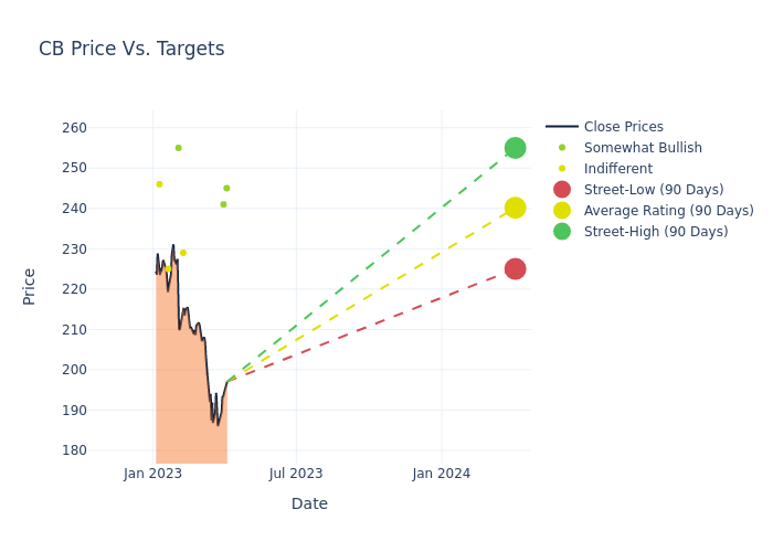 According to 7 analyst offering 12-month price targets in the last 3 months, Chubb has an average price target of $240.0 with a high of $255.00 and a low of $225.00.