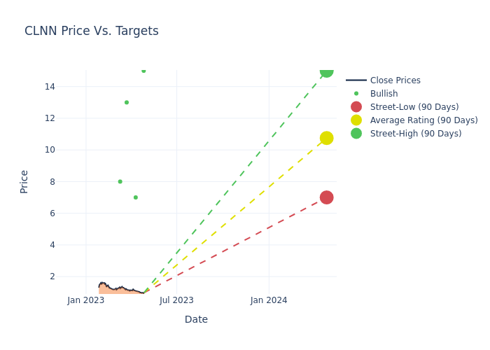 According to 12 analyst offering 12-month price targets in the last 3 months, Clene has an average price target of $13.08 with a high of $15.00 and a low of $7.00.
