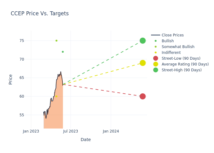 In the last 3 months, 4 analysts have offered 12-month price targets for Coca-Cola Europacific. The company has an average price target of $70.0 with a high of $75.00 and a low of $60.00.