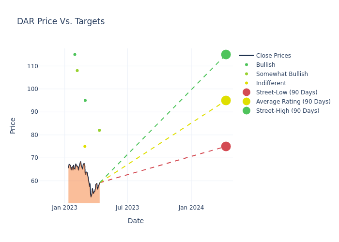 In the last 3 months, 8 analysts have offered 12-month price targets for Darling Ingredients. The company has an average price target of $95.38 with a high of $115.00 and a low of $75.00.