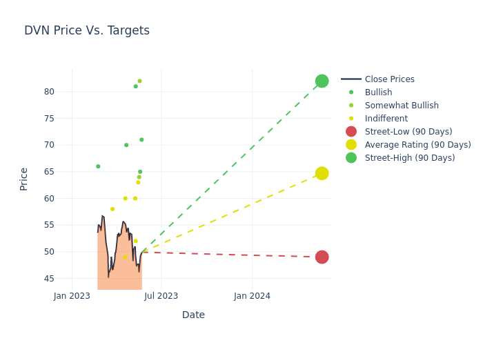 According to 22 analyst offering 12-month price targets in the last 3 months, Devon Energy has an average price target of $68.59 with a high of $89.00 and a low of $49.00.