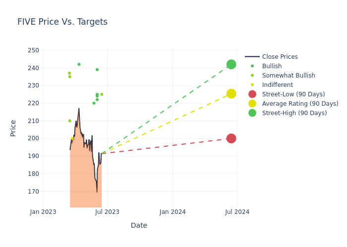 In the last 3 months, 11 analysts have offered 12-month price targets for Five Below. The company has an average price target of $224.73 with a high of $242.00 and a low of $200.00.