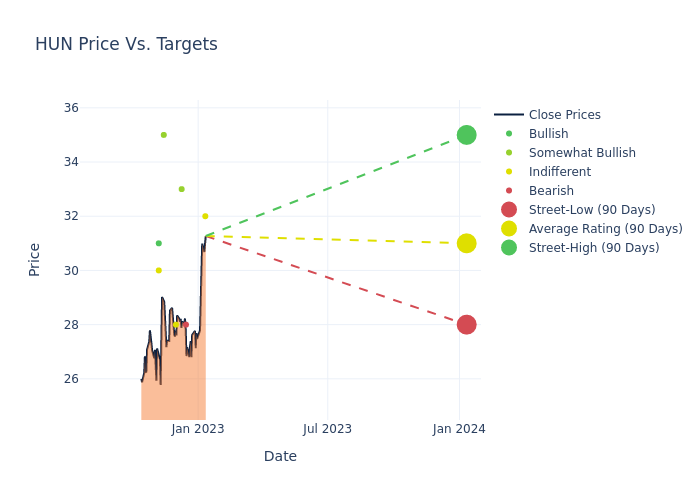 These 7 analysts have an average price target of $31.0 versus the current price of Huntsman at $31.27, implying downside.