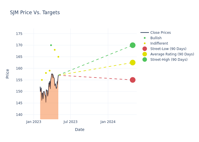 In the last 3 months, 6 analysts have offered 12-month price targets for JM Smucker. The company has an average price target of $162.5 with a high of $170.00 and a low of $155.00.