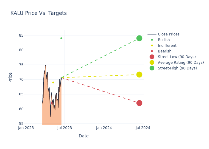 In the last 3 months, 4 analysts have offered 12-month price targets for Kaiser Aluminum. The company has an average price target of $74.75 with a high of $84.00 and a low of $62.00.