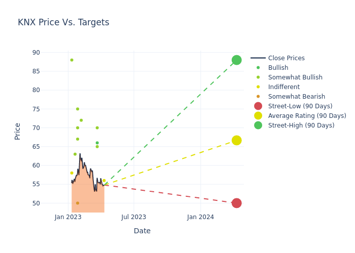 According to 14 analyst offering 12-month price targets in the last 3 months, Knight-Swift has an average price target of $66.5 with a high of $88.00 and a low of $50.00.