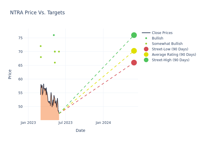In the last 3 months, 7 analysts have offered 12-month price targets for Natera. The company has an average price target of $70.29 with a high of $76.00 and a low of $66.00.