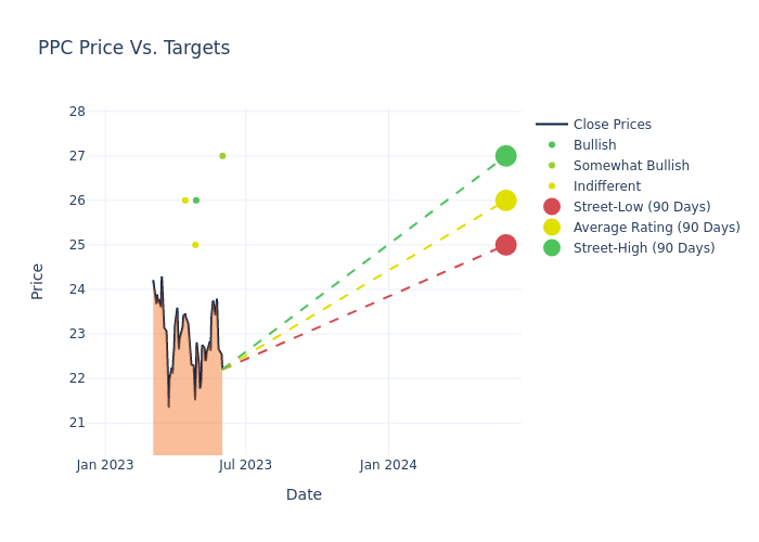 In the last 3 months, 5 analysts have offered 12-month price targets for Pilgrims Pride. The company has an average price target of $26.4 with a high of $28.00 and a low of $25.00.