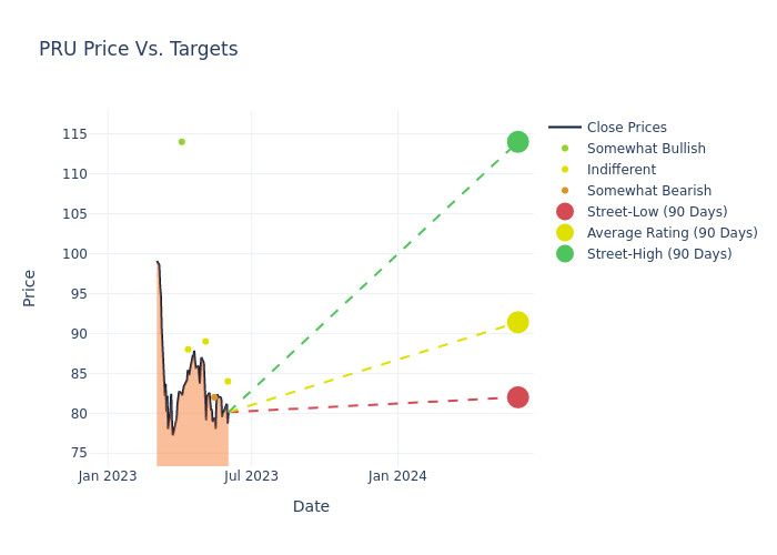 According to 6 analyst offering 12-month price targets in the last 3 months, Prudential Financial has an average price target of $92.67 with a high of $114.00 and a low of $82.00.