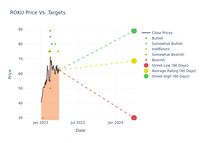 In the last 3 months, 21 analysts have offered 12-month price targets for Roku. The company has an average price target of $70.0 with a high of $89.00 and a low of $30.00.