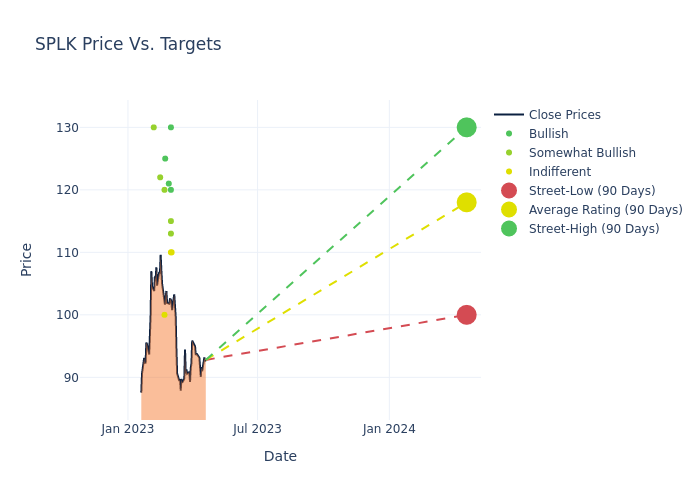 In the last 3 months, 15 analysts have offered 12-month price targets for Splunk. The company has an average price target of $118.4 with a high of $130.00 and a low of $100.00.