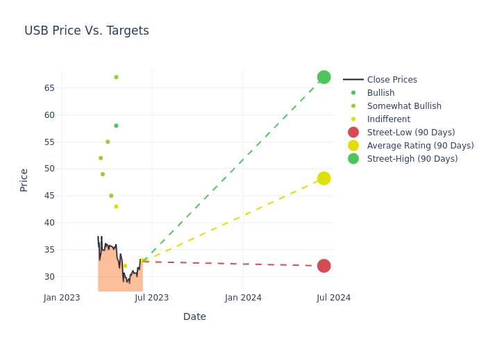 In the last 3 months, 13 analysts have offered 12-month price targets for U.S. Bancorp. The company has an average price target of $48.08 with a high of $67.00 and a low of $32.00.
