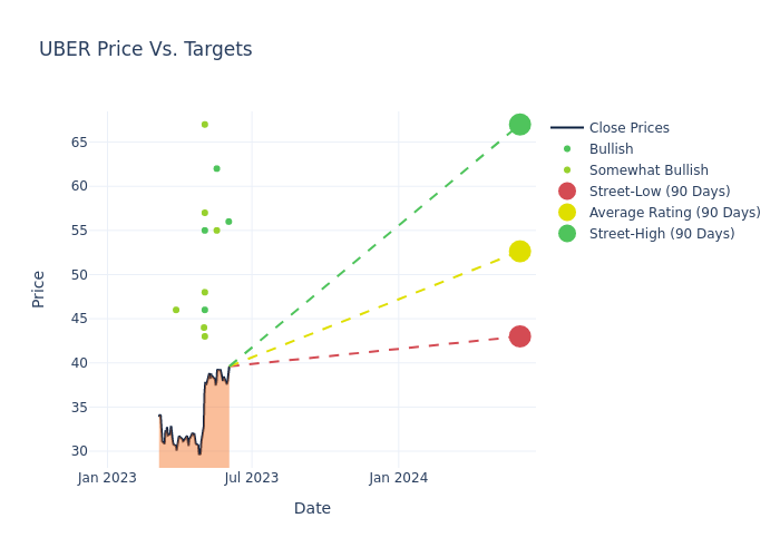 According to 18 analyst offering 12-month price targets in the last 3 months, Uber Technologies has an average price target of $53.28 with a high of $67.00 and a low of $43.00.